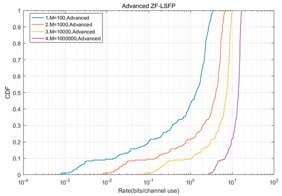 In the simulation, different numbers of base station antennas were used, M was set to 100, 1000, 10,000, and 1,000,000. Channel transmission rate can be calculated by (36). The simulation results show the lowest achievable rate in a cellular network group.