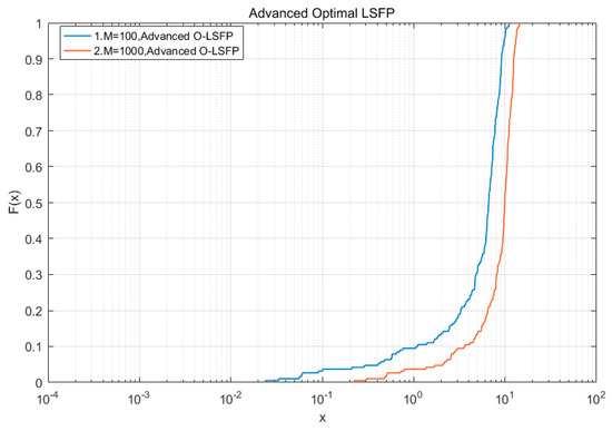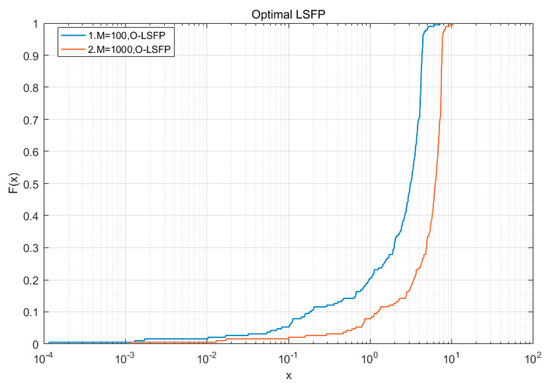 was zero; when the number of antennas was 1000, the probability that the O-LSFP could achieve a channel transmission rate greater than