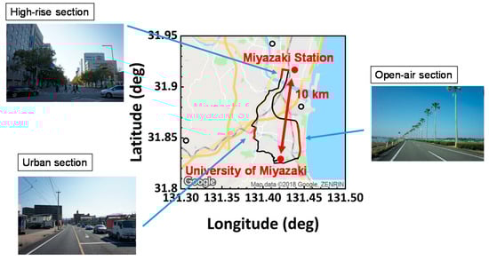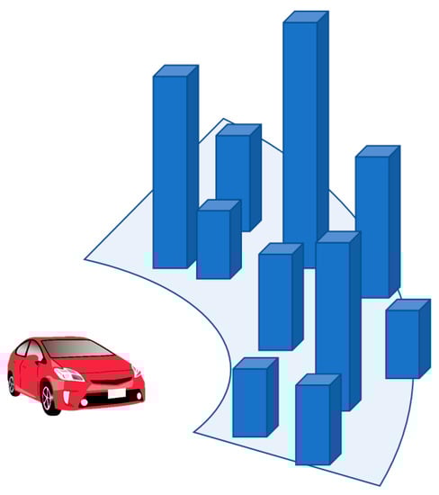 The meteorological data and irradiance data are given by the solar irradiance database, specifically, families of MEteorological Test data for PhotoVoltaic system (METPV), specifically, METPV-3 [44], METPV-11 [45], and METPV-ASIA [46]. It provides both direct and diffused irradiance every hour. The discrete sampling also makes the distribution shaggy, and to make it continuous, the event time is shifted in the range of plus or minus 30 min, also given by the random number under the ranged uniform distribution. The variance of the reflectance by the road and buildings (or mountains, etc.) also fluctuates the direction of the leading solar beam to the car. The modulation of the reflectance is also given by the random number, precisely, 0.10 to 0.40 for vertical reflection (building or trees), and 0.00 to 0.14 for the horizontal reflection (road).