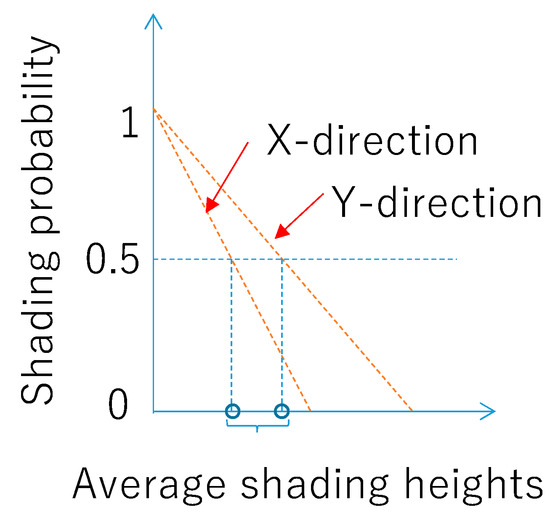 Assuming that the segmented annular region, and the building or other shading objects are randomly distributed in this region with random height (Figure 1), the probability of the shading can be approximated as a linear relationship [26], because the height of the shading object is assumed to be inversely proportional to the distance from the car, whereas the number of shading objects along the arc of the given distance is proportional to the distance from the car so that the product of two factors is the constant value (Figure 2). Note that it is convenient to represent the height of the surrounding buildings and other shading objects scaling by the shading angle (grazing angle) [24].