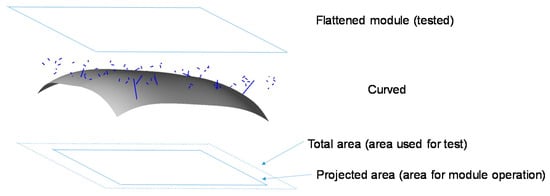 The second cause is the aperture area; namely, the module area in the active region of the curved module is not defined clearly (Figure 5) and may have multiple definitions. It is a cause of fatal error in the estimation of the module efficiency in the dividing area of the module (Equations (17) and (18)).