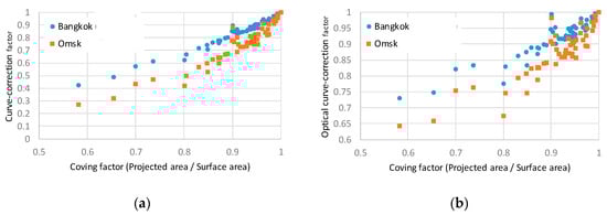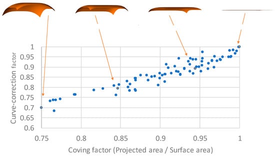 The curve correction factor decreases by the increase of curvature of the surface [20], corresponding to the ratio of the projected area by surface area (Figure 8). The geometrical factor f1 dominates it, but the optical curve correction also decreases by the increase of the curvature as well. However, the optical influence depends on the surface shape, and it is essential to calculate its factor to every curve surface.