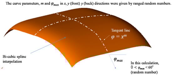 The curve correction factors of the various shape of the car roof are calculated and plotted in Figure 8; each corresponding marker in the plot was given by the random numbers. The curve shape of the car roof widely varies. Random numbers model each surface with an approximation of the bi-cubic spline function structured by the power function of the tangent lines (Figure 1). The curve shape profile is approximated as the segmented (symmetrical to left–right direction, but asymmetrical to front–back direction) power function constrained by the maximum slope at the edges. Specifically, it keeps symmetry in the X direction, but allows asymmetry in the Y direction, considering that the curve shape of the car roof may vary in the front and tail of the car body. The synthesis calculation is illustrated in Figure 9.