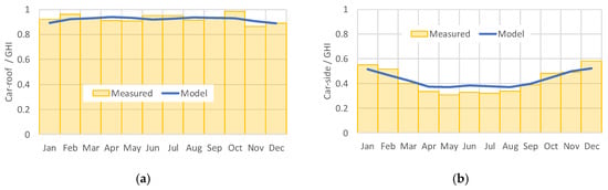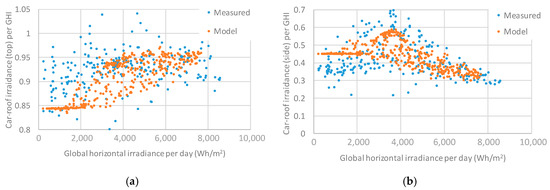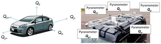 Mounting five orthogonally-arranged pyranometers, and applying Equations (8)–(16) to the monitored irradiance data, the three-dimensional solar irradiance around the vehicle may be modeled [27].