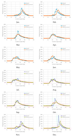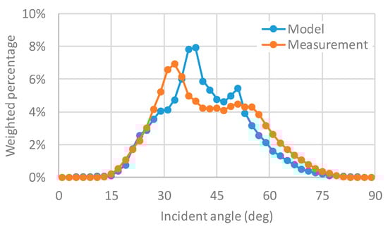 However, the measurement system defined in Figure 3 does not have enough angular resolution. Instead, the measurement of the incident angle of the main beam is done by the ratio of the vertical irradiance (car roof) and the highest two irradiances of the car side, specifically, in Equation (10). The validation of the model in the angular distribution in this article is done by comparison of the weighted histogram of the main beam of the solar irradiance using Equation (10).