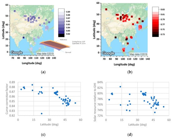 Map of the effective solar irradiance for the car roof: (a) curve-correction factor in a typical car roof; (b) effective solar resource to the car roof normalized to GHI, including the loss by the curved surface; (c) correlations between latitude (related to the sun height) and the curve correction factor; (d) correlations between latitude (related to sun height) and the effective solar resource to the car roof normalized to GHI, including the loss by the curved surface.