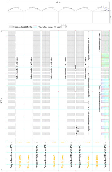 The greenhouse structure was formed by galvanized steel tubes. The greenhouse roof structure was a two-span metal frame with 6 modules of 7 m of width (Figure 1). The ridge height in the roof was 6.63 m and gutter height was 5 m. The cover material of the greenhouse was plastic in lateral and frontal walls, while several materials (plastic, photovoltaic panels, opaque sheets of polyethylene and transparent sheets of corrugated polycarbonate) were located in the rooftop, as Figure 1 shows.