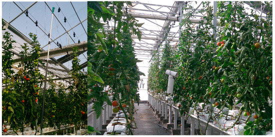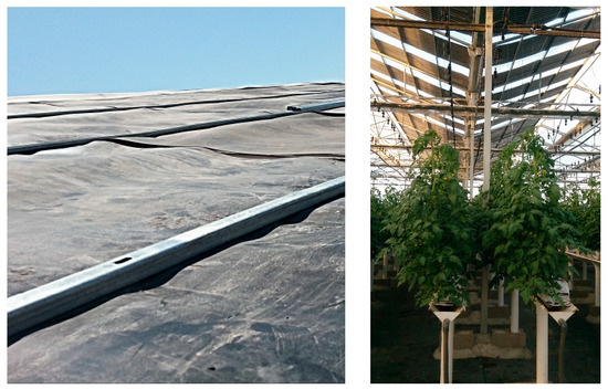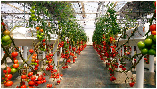 Plants were grown in coco fiber artificial substrate, located in 1 m high platforms (Figure 4). This hydroponic cropping system is usual in the South–East Spanish greenhouse production area. Plant density was 1.72 plants·m−2. Water and nutrients were applied with fertigation techniques through an irrigation pipes layout over the substrate. Drippers of 2 L·hour−1 were located with a distance of 0.5 m in each line of crop. Cultural cropping techniques like pruning, defoliation, guiding and fertigation were applied as usual in a tomato hydroponic cropping system in the area of study [25,37].