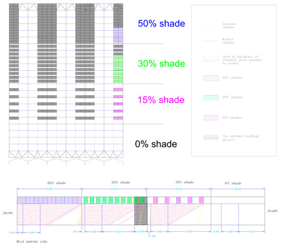 Location of photovoltaic modules and polyethylene sheets in the roof-top greenhouse (up). Projected shades inside the greenhouse of different shading treatments (down).