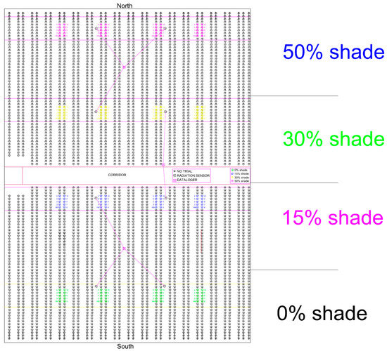In order to evaluate the effect of different shading levels that would produce the installation of photovoltaic panels in the rooftop greenhouse, an experimental design was planned with 3 shadow treatments of 15%, 30%, and 50%. The three treatments were compared with a control treatment with 0% shading. Shaded treatments were 630 m2 of the surface and the control treatment, 0% shade, of 525 m2 (Figure 3). Each treatment was evaluated and climatic control, yield and quality parameters registered.
