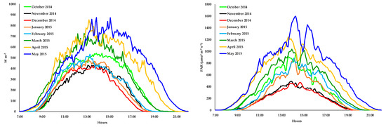 Outside average monthly radiation (W m−2) evolution for the studied period (left). Average monthly photosynthetic active radiation (PAR) in the control treatment (0% shade) for the studied period (right).
