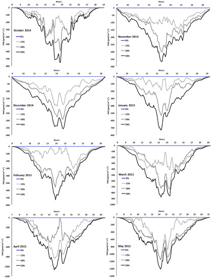 Figure 8 shows, for the studied period, the average daily evolution of the monthly reduction of PAR radiation produced by shading treatments (15%, 30% and 50%) in regards to the control treatment (0% shade). We could observe that generally, every month, PAR radiation reduction was proportionally higher than the shading surface in the roof-top. Specifically, the shading treatments of 15%, 30% and 50% of the shadowed surface in the roof-top resulted in a reduction in real PAR radiation for the crop of 28.8%, 46.6% and 66.3% respectively (Figure 9).