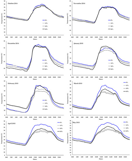 Average daily evolution of temperature in shadow treatments (0%, 15%, 30% and 50%) for the studied months.