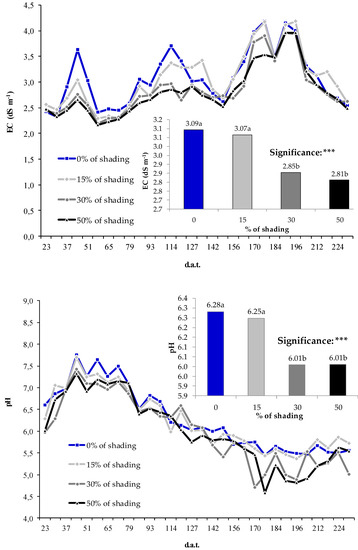 Electric Conductivity (EC) and pH in the substrate solution was statistically higher in the control treatment (0% shade) and 15% of the shade treatment than in the rest of treatments with a higher shadow percentage (Figure 11). The analysis of the average data in the period shows that the highest pH and EC values were registered in the control treatment (0% shade) with pH = 6.28 and EC = 3.09 dS·m−1. In treatments with the highest shadow percentages (30% and 50%), results were similar, registering the 50% treatment as the lowest values (6.01 of pH and 2. 81 dS·m-1). The evolution in time of both of the parameters in the substrate solution was similar for all the studied treatments (Figure 11). EC showed a slight increase tendency during the cropping season, instead, pH, after an increase at the beginning (37 d.a.t), showed a decrease tendency until the end of the cropping season.