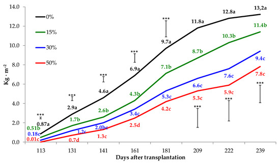 Finally, shadow treatments caused a delay in the production at the end of the cropping season (239 d.a.t). In 174 d.a.t data collection, a cultural technique of terminal bud elimination was applied, to avoid new vegetative material development and to foster fruits development in the last tomato clusters. In shadowed treatments a higher production of green fruits in the last harvesting season was observed (Figure 13). The control treatment (0% of shadow) showed a significantly lower production of green fruits (0.36 kg·m−2) in regards to the shadow treatments (15%, 30% and 50%) where green fruits were 0.91, 1.52 and 1.32 kg·m−2 respectively.