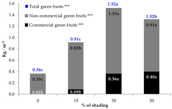 The excessive shading percentage in the 50% shadow treatment produced a significant reduction in the number of produced fruits by plants in regards to the control treatment, (0%) and the 15% shadow treatment. The number of commercial fruits did not show significant differences between the control treatment (0%) and 15% and 30% treatments. However, a reduction of the number of fruits associated to the shadow percentage could be observed (Figure 14). Higher yields of commercial fruits were produced in the control treatment (0% shade) with 128 fruits·m−2, followed by the 15% shadow treatment (119 fruits·m−2), and the 30% shadow treatment (103 fruits·m−2). In the 50% shadow treatment the number of fruits (86 fruits·m−2) were the lowest, however no significant differences with 15% and 30% treatments were found.