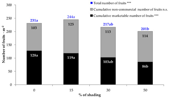 Shading effect on the number of fruits (total, commercial and non-commercial) by m−2, harvested in the last harvesting period (239 d.a.t). Results comes from the analysis of the variance that is performed according to the Yij model = µ + αi + βj + εij. The nomenclature n.s., *, ** and *** indicates not significant or significant for p ≤ 0.05, 0.01 and 0.001, respectively. Numerical values for each column followed by different letters denote statistical significance for p < 0.05 according to the corrected minimum significant differences (LSD) test.