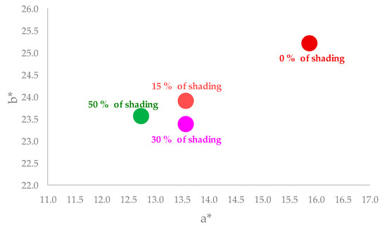 Fruit color showed significant differences between shadow treatments. The intensity of the fruit color, represented by the croma, increased when shadow percentage was reduced (Table 2). The control treatment showed the highest color intensity, with a 30.15 croma value, besides this asseveration, it could be seen with the highest values of a* and b* (Figure 15).