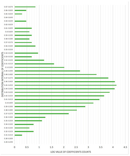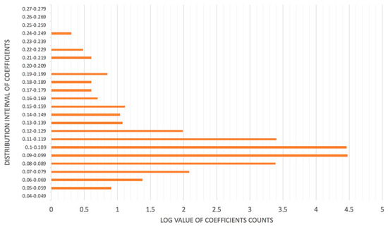 Distribution of routing coefficients for the same training image from the CIFAR-10 dataset for network training using Sigmoid. The horizontal axis represents the logarithm of the number of coefficients to base 10; the vertical axis represents the interval of coefficients.