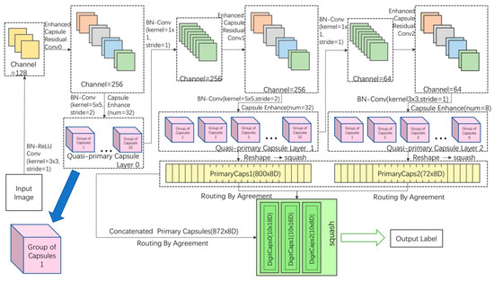 The group of enhanced capsules is named . The enhanced capsule blocks are inserted in between the residual blocks in enhanced capsule residual convolutional subnetworks. Furthermore, the enhancement is introduced after convolution on the quasi-primary capsule layers.
