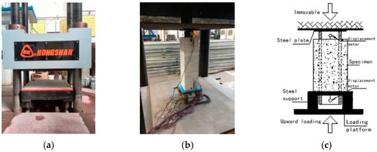 The push-out test was carried out on the 2000t compression testing machine in the State Key Laboratory for civil engineering at Xi’an University of Architecture and Technology. Figure 3a,b show photos of the test setup and push-out specimen. The upper end of the specimen was fixed and the lower end was free. A mild steel plate with an “H” hole connected the bottom of the specimen with the loading platform. The topside of the section steel was attached to the compression testing machine with a complete steel plate. A foam pad was laid between the steel support and RAC to ensure flatness, and the loading rate was 0.3 mm/min. Slip occurred initially in the lower part and gradually in the upper part. Therefore, from the perspective of the section steel, the loading end of the specimen was defined at the lower end and the free end was in the upper portion. Double displacement meters were set at the loading end and the free end, respectively, which are shown in Figure 3c.