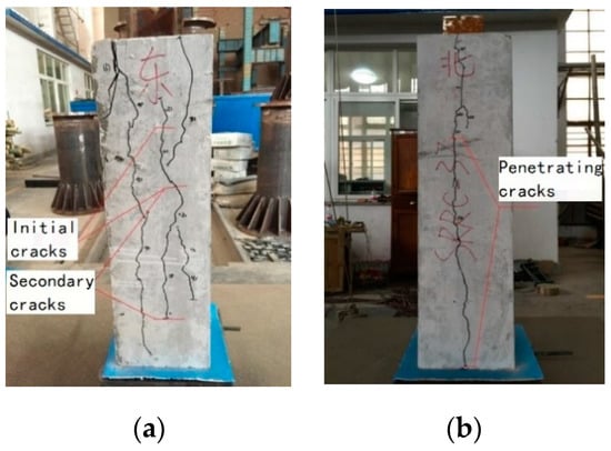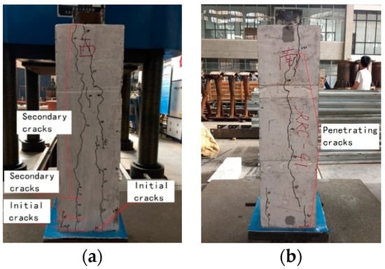 With bursting failure, the initial cracks occurred in the middle of the flange or the web. As the load increased, the initial cracks gradually expanded toward the loading and free ends, and some new fine cracks occurred. When the load reached about 80%–90% of the ultimate load, the initial cracks continued expanding and widening, and there were many obvious secondary cracks. As shown in Figure 5 (taking SRRC-1 as an example), through cracks were present on both the flange and the web sides after failure. This is one of the main features of bursting failure that makes it different from the splitting failure.