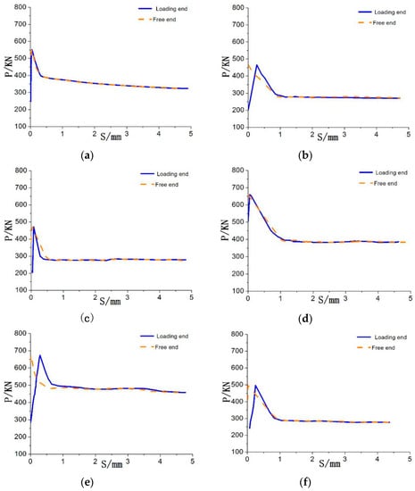The loading end slip curve (P-S curve) can be simplified to the model shown in Figure 6. Here, The load is divided into two categories, each of them showing basically the same changes, which are divided into three parts: rising, sag, and gentle loads. Type (I) is characterized by a large initial load (65%–75% of the peak load), with a residual load that is slightly lower than the initial load. Type (II) is characterized by a small initial load (40%–65% of the peak load), with a residual load that is slightly higher than the initial load. The P–S curves of the specimens are shown in Figure 7.