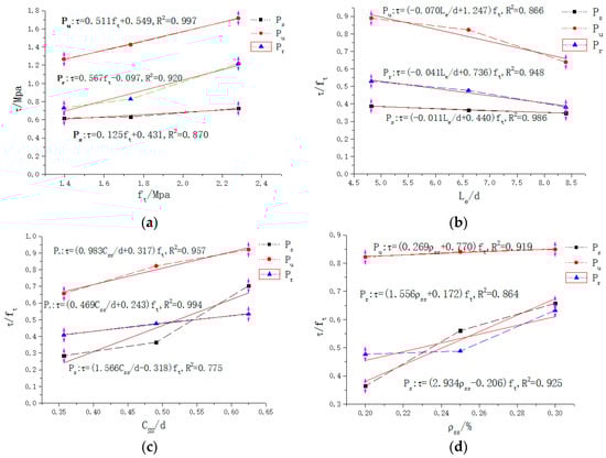 The characteristic bond load and the average characteristic bond strength of specimens are shown in Table 5. The formulas for the average bond stress of the four factors were established by statistical regression analysis. They can be expressed as follows.