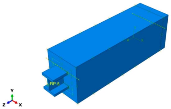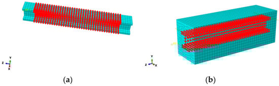 The solid element C3D8R for section steel and RAC was used in this study, which is an 8-node hexahedron reduction integral element. This element has more accurate results and saves calculation time, and is also suitable for meshing refinement. The linear three-dimensional truss element T3D2 was adopted for steel and stirrups, which has two nodes, each with three degrees of freedom. The steel and stirrups were assigned as truss elements when meshing.