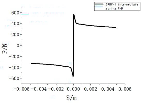 The F–D relationship of the springs under each node can be calculated through the bond slip constitutive relation, which was obtained from the test. However, the calculated F–D relationship did not pass through the coordinate origin and did not satisfy the input requirements of Abaqus, so it was processed. It was completely symmetrically processed in its negative direction in order to complete the F–D curve. The F–D relationship is shown in Figure 13 (taking the intermediate node of the spring at SRRC-1 as an example).