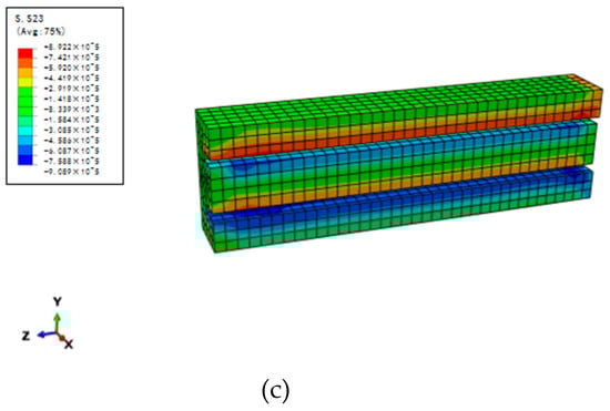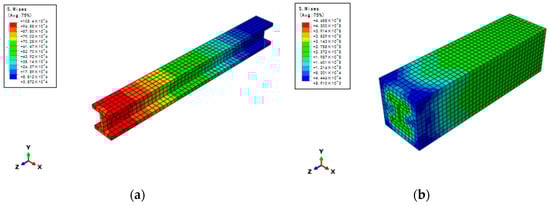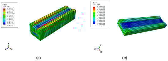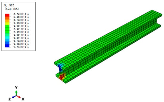 This study mainly investigated longitudinal shear stress. The stress nephograms of the specimen in the direction of S23 (S23 stands for shear stress in Abaqus) are shown in Figure 15 and Figure 16. It can be seen that the longitudinal shear stress is relatively uniform distribution along the embedded length. The bond strength is weakest at the outside of the lower flange, and it is greatest at the inside of the lower flange and at the upper flange, which are the main bearing parts of the flange. The bond strength at the inner side of the web is equivalent to the outer side of the lower flange, which is much smaller than the bond strength at the outer side of the web.