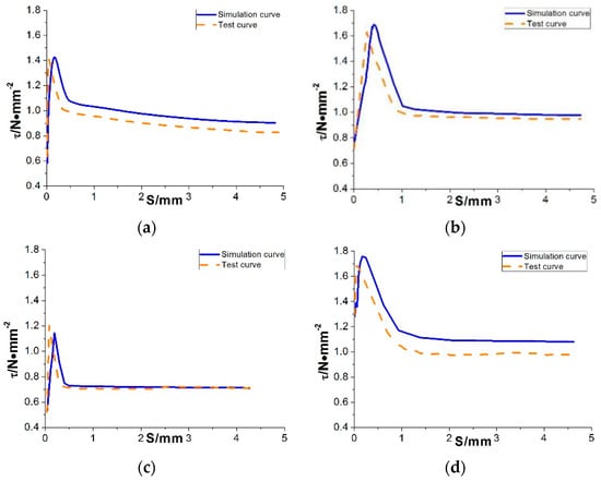 It can be seen that the simulation results of initial bond strength, ultimate bond strength, and residual bond strength are basically equal with the test results. In the limit state, the slip value corresponding to the characteristic bond strength is larger than the test value, and the difference is within 0.15–0.65 mm. The slip value is close to the test value in the residual state, and the difference is within 0–0.15 mm.