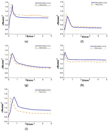 Simulation and test curves of τ-s: (a) SRRC-1; (b) SRRC-2; (c) SRRC-3; (d) SRRC-4; (e) SRRC-5; (f) SRRC-6; (g) SRRC-7; (h) SRRC-8; (i) SRRC-9.