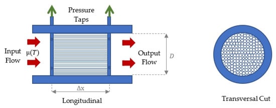 Equation (1) establishes that for a laminar flow there is a linear relationship between the flow rate and developed pressure drop. A major drawback of this type of flowmeter, however, is its dependence on fluid viscosity, which in turn is mostly dependent on fluid temperature. Thus, any laminar flowmeter requires some form of temperature compensation to obtain precise measurements [4]. In Figure 1 there is a scheme of a longitudinal and a transversal cut of a laminar flowmeter.