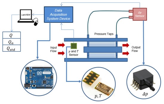 The DAQ system used to automate the laminar flowmeters in this work was composed by: two sensors (an absolute pressure and temperature sensor and a differential pressure sensor), an Arduino microcontroller board and a computer (Figure 2).