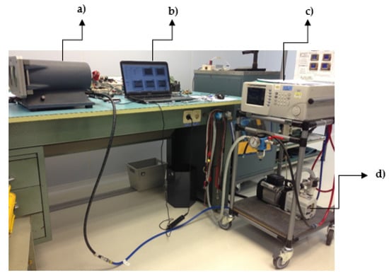 Calibration’ setup: (a) barometric chamber; (b) laptop computer; (c) Air Data Test Set (ADTS) and (d) vacuum pump.