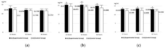 | G1 | 12.69 ± 1.47 | 12.07 ± 0.80 | 11.73 ± 0.78 | 15.30 ± 0.68* | 15.28 ± 1.23* | 14.72 ± 0.58* | 13.15 ± 0.30* | 13.46 ± 0.47* | 13.05 ± 0.82* |