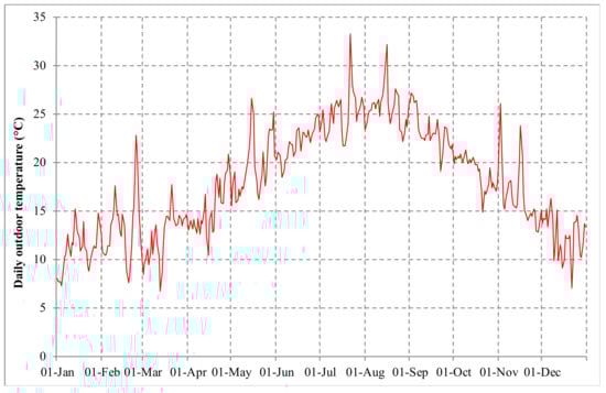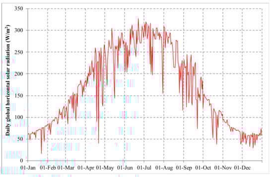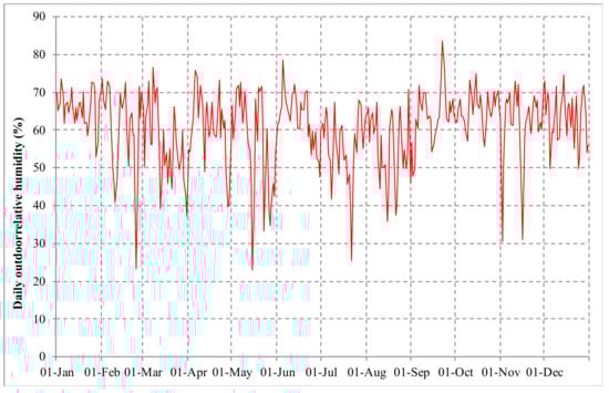 As regards the weather conditions of the site, they were typical of the South of Italy, characterized by a temperate climate with warm summers and mild winters. Figure 2, Figure 3 and Figure 4 show the trend of outdoor air temperature (T), relative humidity (RH) and solar radiation (IR), respectively, during the monitoring period of one year.