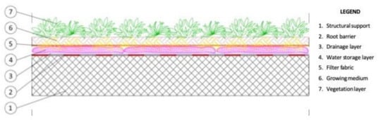 Going from the indoor to the outdoor sides of the building, as shown in Figure 5, the green roof compound is composed of the following layers: a root barrier (with a waterproofing membrane), a drainage layer (made of a polyethylene geo-net, hot-coupled with a non-woven geotextile with filtering functions), a water storage layer (constituted by cushions filled with expanded perlite), a filter fabric (composed by a geotextile felt, 100% polypropylene calendered), a growing medium (which is a mixture of peat, lapillus, pumice, zeolite and slow releasing fertilizers and is infesting weeds free) and the vegetation layer.
