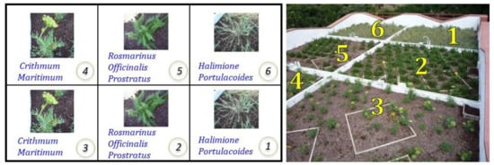 As for the vegetation characteristics, Figure 7 shows how the Halimione Portulacoides (both P1 and P6) and the Rosmarinus Officinalis Prostratus (only P5) reached full coverage (100%) in less than 12 months while the Rosmarinus Officinalis Prostratus in P2 achieved a maxim coverage of about 85% in the same period and the Crithmum Maritimum (both P3 and P4) did not accomplish more than 40%–60%, showing the difficulty of establishing it in the considered environment [52].