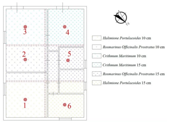 In order to also analyse the effects provided by different plant species and different thicknesses of the water storage layer on the green roof thermal behaviour, the roof was divided into six sectors, where three different Mediterranean autochthonous species (Halimione Portulacoides, Rosmarinus Officinalis Prostratus and Crithmum Maritimum) and two different thicknesses of the water storage layer (10 cm for plots 1, 2, 3 – P1, P2, P3 – and 15 cm for plots 4, 5, 6 – P4, P5, P6 –) were used according to the scheme reported in Figure 6.