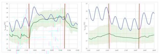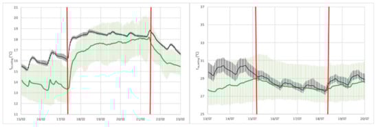 Similarly to the previously reported Figure 9, Figure 10 contains the obtained results for the two five-days periods representative of winter (on the left) and summer (on the right) conditions. In particular, the green lines (Scenario #1) and the red lines (HVAC system start-up intervals) are the same as shown in Figure 9, while the black lines represent an average of the values obtained for the six plots, with the relative ranges of variation, using the Scenario #2 EnergyPlus settings.