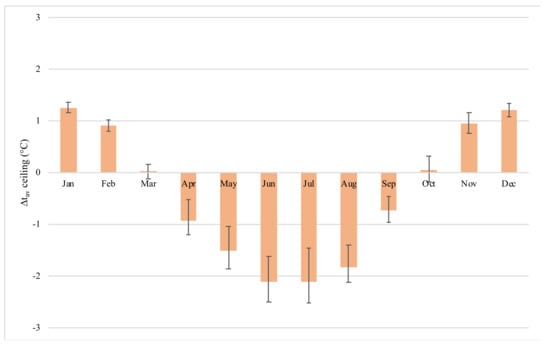 To compare Scenario #2 with Scenario #3 in relation to indoor comfort levels, it was decided to report, in Figure 11, a graph of the monthly temperatures. The graph indeed allows to show the deviations of the average values of the green roof ceiling temperatures (Δtav,ceiling) compared to those of the standard roof, where the black bars represent the range of deviation from the average values.