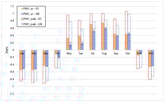 Another aspect which should be better investigated, regards the PMV results (Figure 12). In fact, even though, also, in this case, a general positive effect due to the presence of the green roof can be seen, some criticalities emerged during some transition periods, for which the standard roof seems to perform slightly better than the green roof.