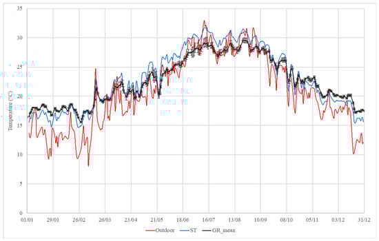 For the sake of completeness, it was decided to report, in Figure 13, an annual plot where the average daily external temperatures (Outdoor) are compared with those of the ceiling in the presence of the green roof (GR_mean) and with those relative to the standard roof (ST).