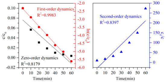 The degradation catalyzed with a UV light, a hydrogen peroxide alone, and a combination of UV and hydrogen peroxide are compared (the obtained results are shown in Figure 7). It can be seen from the kinetic constant that the combination (kUV-H2O2 = 0.0562 min−1, t1/2 = 12 min) is much greater than that of anyone alone (kUV = 0.00 26min−1, t1/2 = 266 min, kH2O2 = 0.0005 min−1, t1/2 = 1386 min), which means the UV-H2O2 system is much more efficient. This is because UV can promote the conversion of hydrogen peroxide to hydroxyl radicals (Equation (2)).