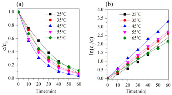 On the basis of the Vant Hoff rule, the higher the temperature is, the higher the reaction rate will be. In this paper, the activity of hydroxyl radicals does increase with the rise of temperature, but hydrogen peroxide, which produces hydroxyl radicals, decomposes into oxygen and water more quickly, resulting in a decrease in the concentration of hydroxyl radicals. The degradation of 0.1 mM [C4Bth]PF6 was investigated in the condition of 100 mM H2O2 and pH 5.06 for different temperatures 25 ℃, 35 ℃, 45 ℃, 55 ℃, and 65 ℃. The experimental results are shown in Figure 4. The IL degradation yield increases with the increase of temperature when the system temperature is lower than 45 ℃. When the temperature is greater than 45 ℃, the situation is reversed.