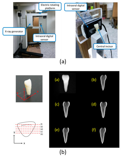 The application of X-ray radiography in clinical dentistry is prevalent. Currently, dental radiographic images can be divided into 2D and 3D radiographic images, and 2D radiographs can be further divided into intraoral and extraoral. Equipment for capturing intraoral radiographs includes periapical, bitewing, and occlusal films, whereas that for extraoral radiographs includes panoramic and cephalometric films. The most substantial problem related to 2D radiographs is the superposition of tissue images, which leads to dentists being unable to accurately determine the solid forms of teeth or bone structures [1,2]. The commonest form of 3D radiography is cone beam computed tomography (CBCT). This technique has the advantages of enabling 3D image developments in diagnosis, giving doctors more information related to the structures and forms of interior tissues at different depths [3]. However, CBCT image resolution can only reach a maximum of 70 µm [4,5]. This resolution is beneficial for examining patients with mandible fracture, nasal cavity, and tooth impaction, as well as for conducting preoperative planning of dental implant surgery. However, lesions such as root microfractures and root fractures are difficult to identify. In recent years, the development of digital periapical radiography has enabled an image resolution of at most 20 µm [6]. This resolution enables clear observation of such lesions. However, the clinical applicability of this approach is still limited in that only 2D images can be captured [7].