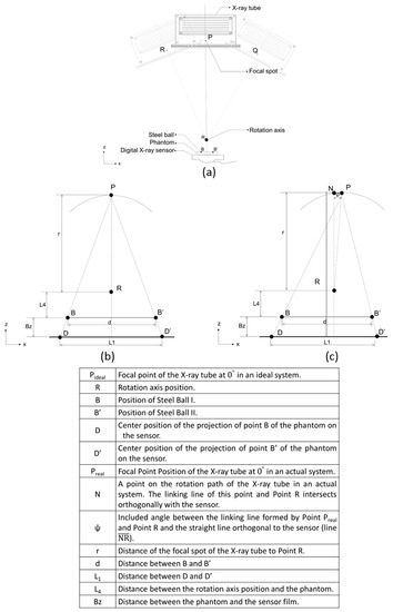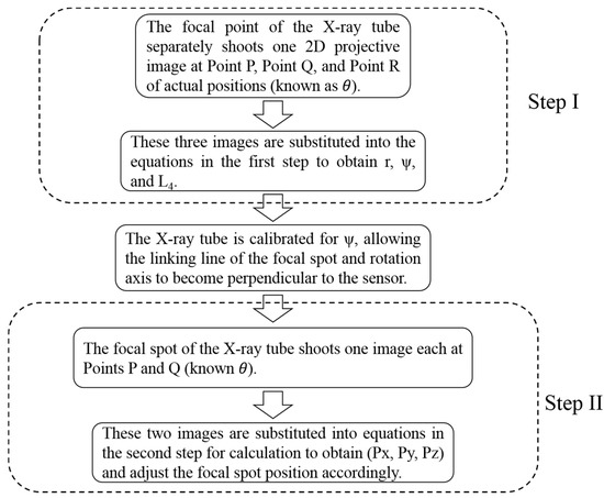 Flow chart of Step I. Step I calculates the distance (r) between the focal spot of the X-ray tube (Point P) and the rotation axis of the X-ray tube’s rotation structure, the angle (ψ) between the linking line of the focal spot (Point P) and rotation axis () and the straight line orthogonal to the sensor, and the distance (L4) between the rotation axis (Point R) and the linking line between the two steel balls of the phantom: (a) The actual hardware positions directly after assembly; (b) the X-ray tube’s focal spot rotates +θ°; (c) the X-ray tube’s focal spot rotates −θ°. P is the position of the focal spot, R is the position of the rotation axis, B and B’ are the positions of the two steel balls on the phantom, and D and D’ are the positions of the projections of the two steel balls on the sensor.