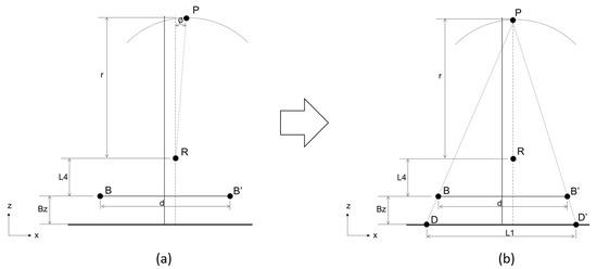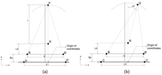 Then, we employ Step II (Figure 6) to calculate the deviational distances (Px, Py, and Pz) on the x, y, and z axes of Point P away from the center of the sensor. Similarly, the two-steel-ball phantom is appressed to the sensor, and the X-ray tube shoots one 2D image at Point P (Figure 6a) with the projective distance of the phantom on the sensor as L1 (= ). Then, the X-ray tube is rotated by θ° (θ can be any value less than 60° except 0°, while 30° is recommended) and moved from Point P to Q (Figure 6b) in order to shoot another 2D image, with the projective distance of the phantom on the sensor being L2 (= ). We substitute the known parameters By, By’, L1, L2, d, and r into the derived equations described as follows to calculate the three parameters Px, Py, and Pz, which are the error values between the focal spot and the ideal position. In addition, Pz + r + L4 + Bz is the distance between the focal spot and the sensor.